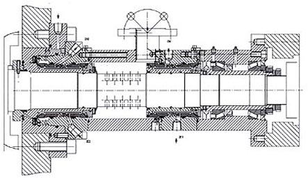 集装两套静止型设计结构的双端面机械密封:停车密封和中间密封以及内置轴承。